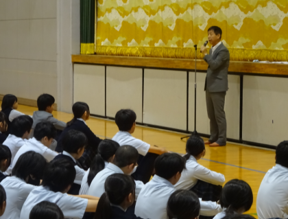 また、校長先生からは先日大きくニュースでも取り上げられたノーベル賞について、理科を専門として指導されていた校長先生らしく、わかりやすく今回の受賞についての解説に加えて、自分を信じて情熱をもって研究を続けた結果につながっているのと話がありました。