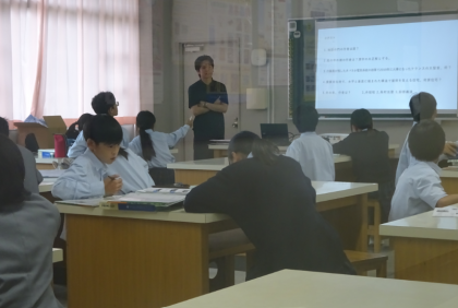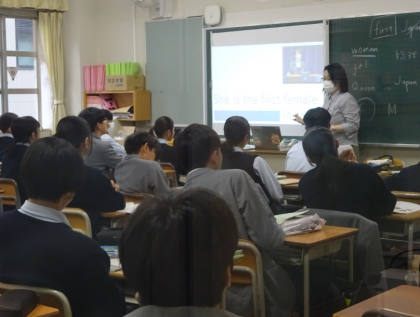 写真は1年生の美術、2年生の社会、3年生の英語の授業の様子です。いずれも、プロジェクターを活用し、テストや問題に取り組んでいます。