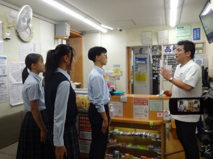 金曜日の放課後に、生徒会役員が西区社会福祉協議会の方々とともに、地域の歯医者や薬局に足を運び、認知症についてのインタビューを行いました。