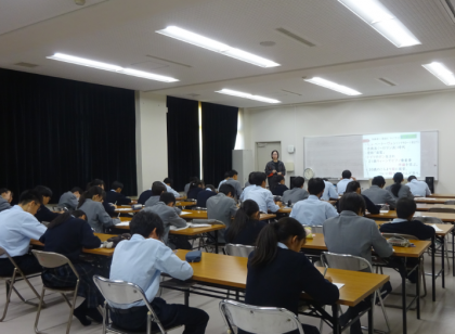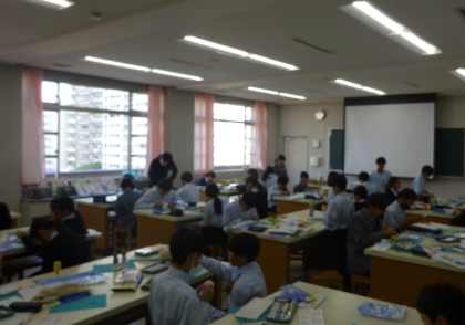 写真は、3限目の授業の様子です。2年生の音楽では鑑賞、1年生の美術では粘土で日用品を擬人化作品の制作、3年生の理科は物理分野の授業が行われていました。