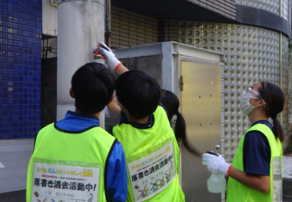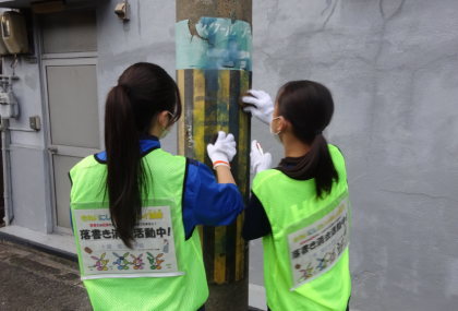 電柱や壁に描かれてしまった心無い落書きを、懸命に消してくれました。きれいなまちづくりへの協力、ご苦労様でした。