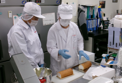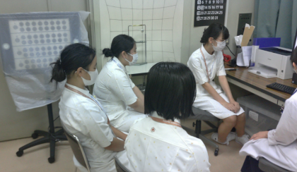 乳製品メーカーや病院での体験の様子です。衣服も貸していただき、表情も真剣そのものです。