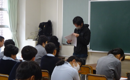 写真は2限目の1・3年生音楽と2年生社会科のテストを受ける様子です。そろそろ、音楽はリスニングテストがスタートします。