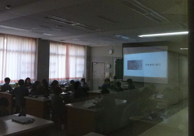 さて写真は、学校での授業の様子です。体育では、運動場でアルティメット(フライングディスクをパスしながらエンドゾーンを目指す団体競技)の練習を、体育館では男子がバスケットボールの試合を行っていました。また、美術ではプロジェクターで「かまぼこ彫り」の映像が映し出されており、彫刻の分野の授業が行われました。