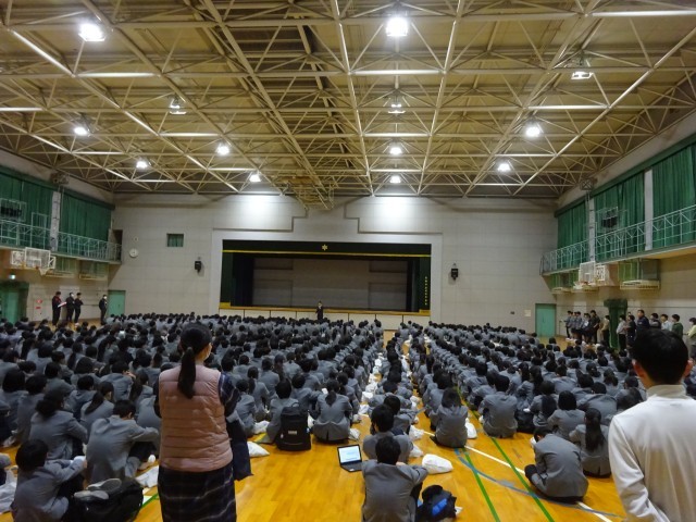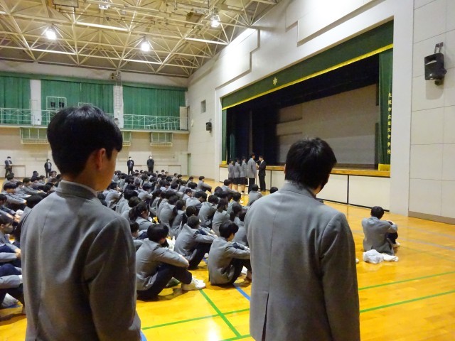 名札がついていない、靴袋を持ってきてない、カバンを持ってきているなど不備のある状態で集会に来ている人が数多くいました。生徒指導主事の国子先生から、今年度の締めくくりの時期(3年生は卒業式までの登校日数は18日、1・2年生は修了式まで23日とあとわずか)であるとの意識を持った行動をとるようにとの話から集会が始まりました。