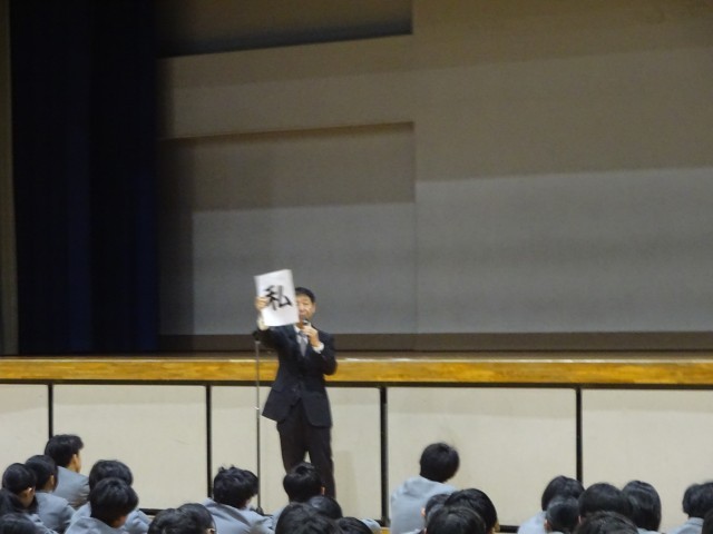 校長先生からは、「私」「公」という言葉について話がありました。「公」とは国家や社会、政府などを指す言葉です。周囲や全体を見て行動することが大切である。特に3年生は私立入試の発表を終え、進路決定がなされた者と、これから公立高校の試験に向けて頑張っている者など様々な立場の生徒が入り混じっています。このような状況でどのような立ち振る舞いをするべきかを考えることも、「公」の意識です。自分自身(私)を大切にしつつ、全体(公)のことを考えることができるようになってください。
