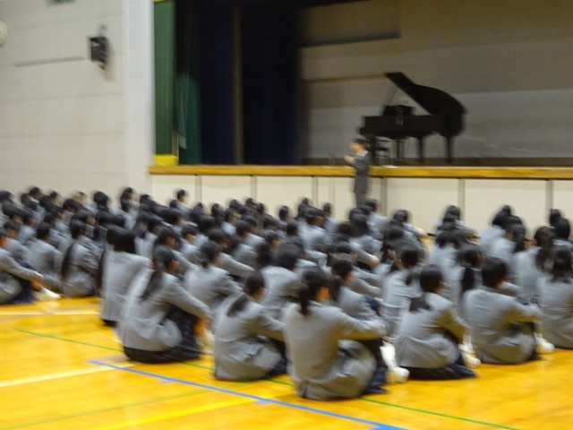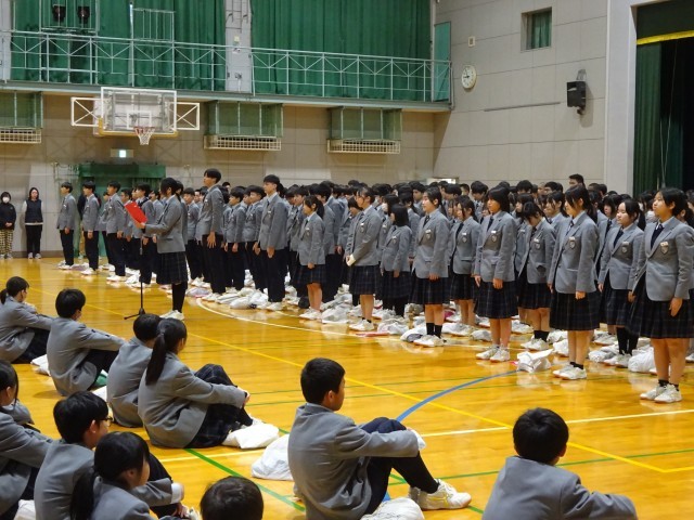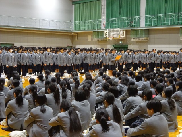 全校生徒が一堂に会して過ごす最後の時間に際して校長先生から、初めて行われた新校舎での入学式に、私も本校の校長として赴任した1年目であったこと、その時と比べれば、心身ともに大きく成長した3年生の姿を喜ばしく感じるとの話がありました。