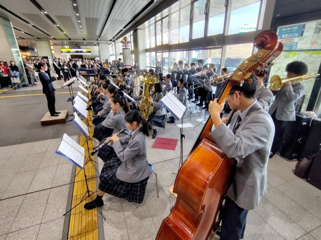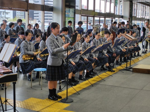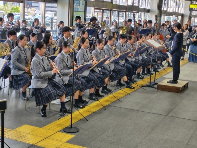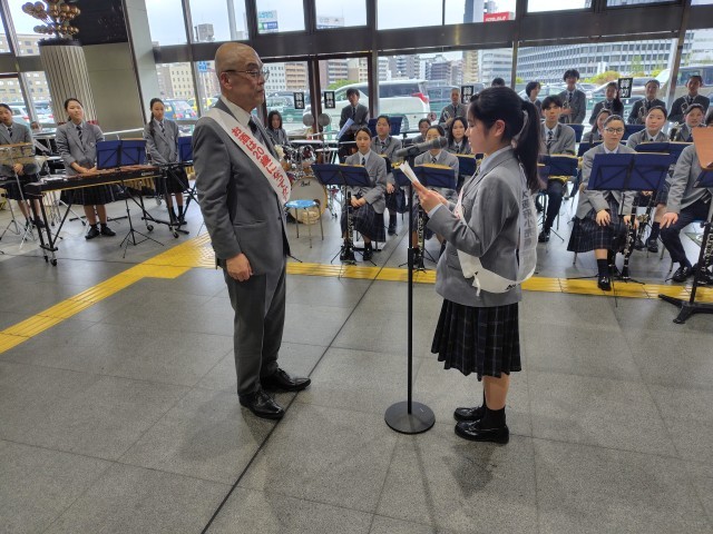 4月6日、新大阪駅で「20歳未満飲酒防止・飲酒運転撲滅全国統一キャンペーン」(大阪府小売酒販組合連合会主催)が実施されました。このイベントの中で、本校の吹奏楽部がミニコンサートをおこないました。また、部長が「20歳未満飲酒防止」の代表宣言しました。ミニコンサートを観ていただき、大きな拍手をいただきました皆様に感謝しています。