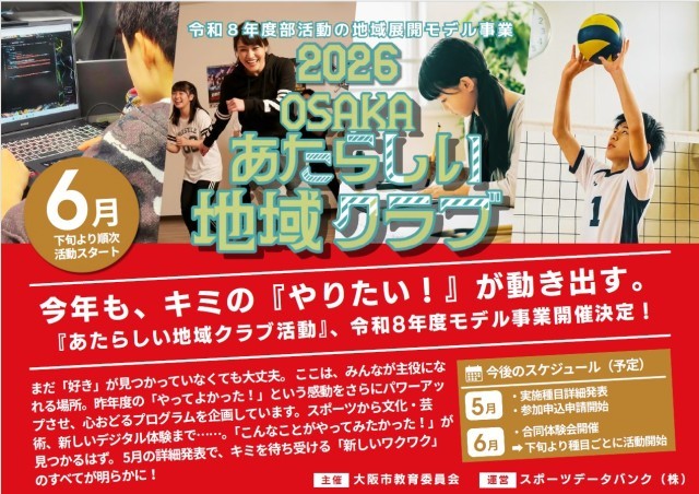 さて、現在大阪市の取り組みとして実施している「あたらしい地域クラブ」について、今年度の活動開始のご案内がありましたので、チラシデータを送付いたします。