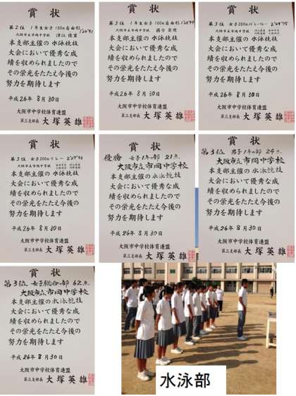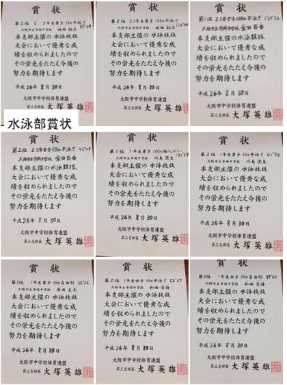 次に水泳部が第3支部主催の水泳競技大会においてたくさんの賞状を頂きました。結果は次の通りです。