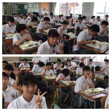 7月18日(木)、一学期最後の給食でした。どのクラスも楽しそうです。配膳員さん、ありがとうございました!ごちそうさまです。