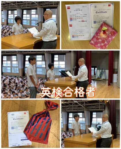 まず、英語検定で優秀な成績を収めた生徒の発表と表彰です。2年生で、英検2級(高校卒業程度)と準2級合格者が出ました。素晴らしい成果にPTAからも記念品が贈られました。