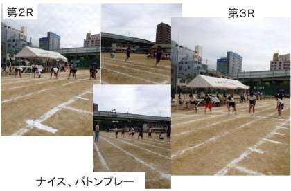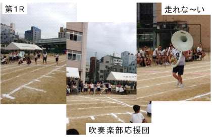 第1Rは、パフォーマンスリレーで、吹奏楽部がファンファーレを担当しました。参加クラブは茶道部・美術部・放送・女子バスケットB(ドリブル)・吹奏楽部Bです。