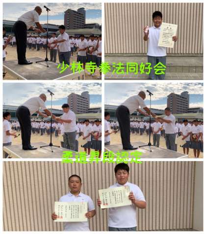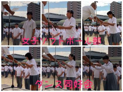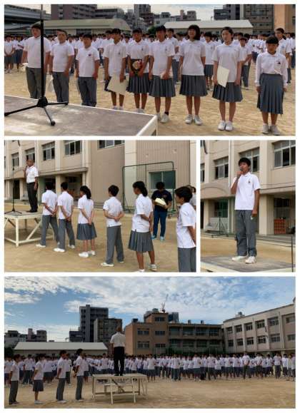 全校集会 9/30 公開日 2019/10/02 更新日 2019/10/18 お知らせ 9月30日(月)、全校集会の様子です。 まず、賞状伝達です。 大阪市中学校秋季総体大会で、女子ソフトボール部が第3位、ダンス同好会が努力賞と奨励賞2つ、少林寺拳法同好会が男子個人第3位という素晴らしい結果でした。また、柔道昇段認定を受けた2人の認定証伝達もありました。 続いて、校長先生からのお話、生徒会から今週の予定の連絡がありました。 いいね(0)