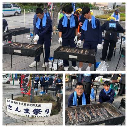 10月13日(日)、八幡屋公園で港区民まつりが行われました。その中で港区老人クラブ連合会が主催している「さんま祭り」に、3年生の生徒会と有志の4人がボランティアとして参加しました。