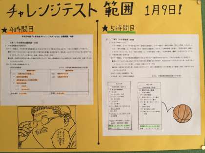 一年生のチャレンジテストについてまとめてくれました。学年トイレ前の掲示板に貼っていますので、参考にして準備しましょう!