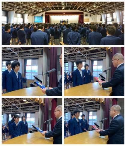 まず最初に英語科から英語検定において、それぞれの学年課題級を2段階飛び級合格した4人の生徒の表彰がありました。(1年2人-3級・準2級合格、2年2人-準2級)