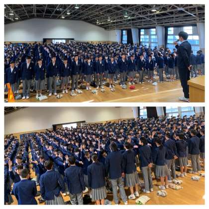 校歌斉唱の後、校長先生からは「今年の10大ニュース」と、熱いメッセージがありました。
