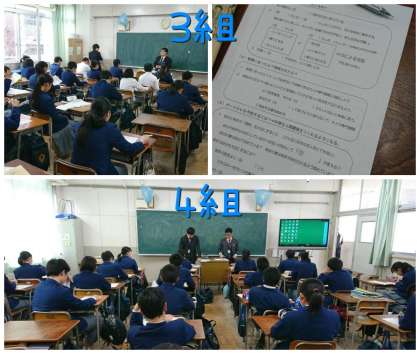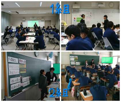 「デートDV」とは、交際相手から受ける暴力のこと。そして、暴力には「殴る、ける」などの身体的な暴力の他に、精神的な暴力や経済的な暴力、性的な暴力などがあり、「一方的に相手を支配すること」のすべてを暴力と呼びます。掲示物やなどの手作りの資料やDVD、ロールプレーイング(役割演技)などを使い、とてもわかりやすく教えてもらいました。大学生の迫真の演技には、拍手喝采!2年生の生徒も意見を発表する時に、積極的に答えたり聞いたりして、とても充実した2時間でした。暴力の種類とともに、それを防ぐ(暴力をしない、暴力をうけない、暴力をうけている人を支える)ことを学びました。これから将来に向けて、ぜひ今日教えて頂いたことを実践して欲しいと思います。