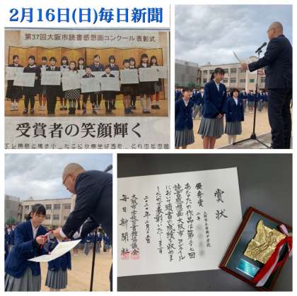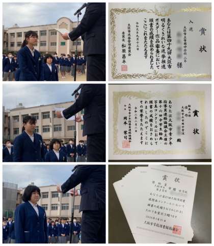 全校集会 2/17 公開日 2020/02/20 更新日 2020/02/20 お知らせ 2月17日(月)、全校集会の様子です。 まず、美術部と美術科の作品で、優秀な成績で各コンクールに入賞した生徒の表彰伝達です。第37回大阪市読書感想画コンクール入賞については、毎日新聞の記事にも掲載されました。 詳しくはこちらをどうぞ→2年生 美術部・美術科 コンクール入賞作品 続いて、校長先生のお話、生徒会執行部から今週の連絡がありました。 いいね(0)