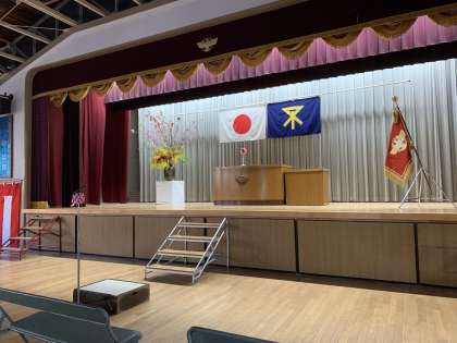 明日の入学式の式場設営が完了しました。 開式は10時です。