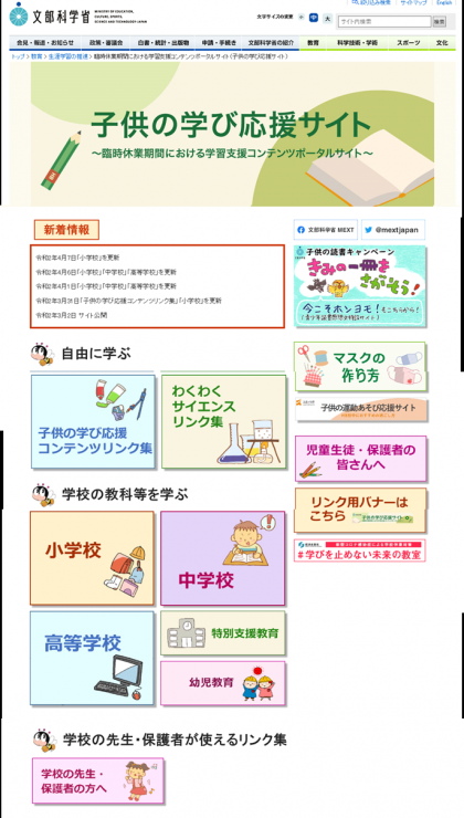 文部科学省のホームページにある「子供の学び応援サイト〜臨時休業期間における学習支援コンテンツポータルサイト〜」を紹介します。