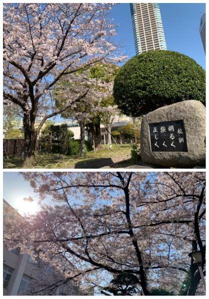 4月9日(木)、正門の桜やプランターの花々がとてもきれいに咲いています。