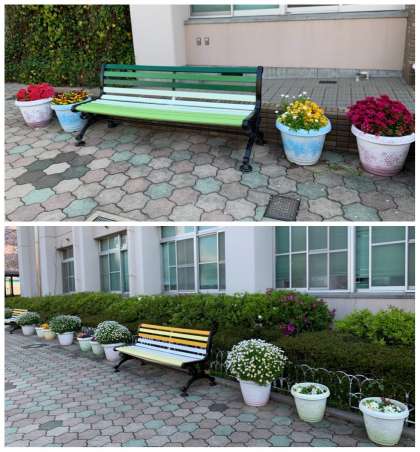 正門の広場にあるベンチは、3月から管理作業員さんがきれいにペンキで塗り直してくださいました。