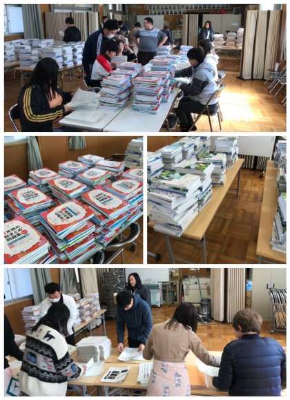 4月10日(金)、教科書給与・学習課題配布に向けての準備を行いました。クラスター発生がないように体制を整えております。受付でのアルコール消毒をお願いします。