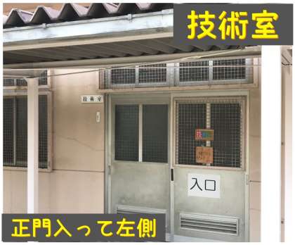 1年生は正門をくぐって左側の「技術室」、2,3年生はグランド(晴天時)で受付の後、多目的室にて給与・配布します。