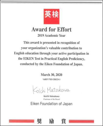 2018年度に引き続き、2019年度も日本英語検定協会から奨励賞をいただきました。