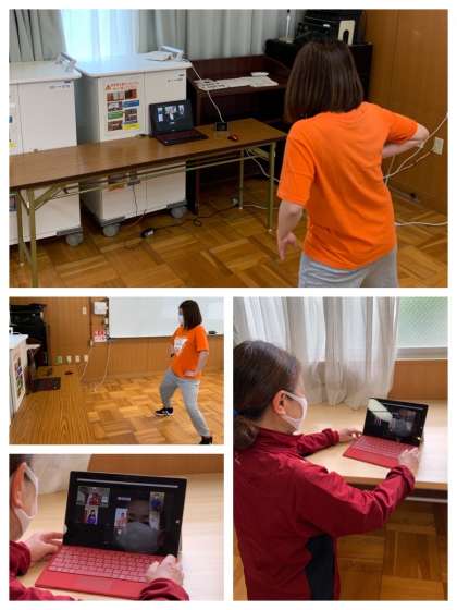 今日はパソコン2台を使いました。1台は動きのモデルになる部活動指導員(コーチ)用、1台は部員の動きをチェックする顧問用として設置し、離れていても細やかな指導ができるのかを実験的に行いました。
