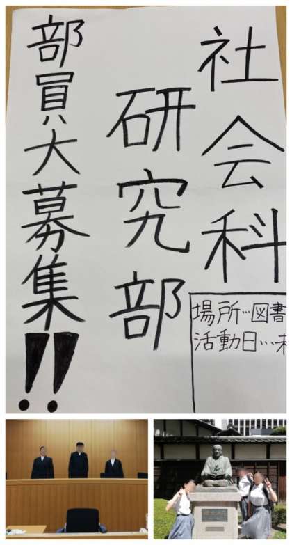 昨年度は、三社神社にフィールドワークに行き図書室で資料をまとめ、新聞を作成しました。新聞は、文化祭で展示発表しました。また、夏休みには大阪高等裁判所の見学・傍聴をしました。