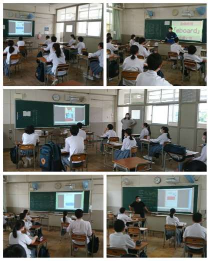今日は、補助教材や生徒手帳の配布、自己紹介用紙の作成、動画教材「eboard」の使い方をスライドで説明をしました。