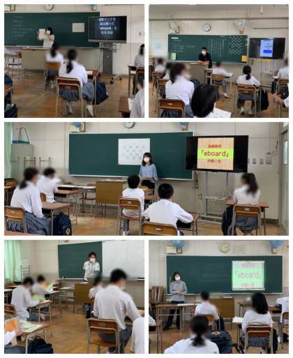 手洗いの後、各教室へ。プリントや課題の配布や回収、動画教材「eboard」の使い方をスライドを使って説明がありました。