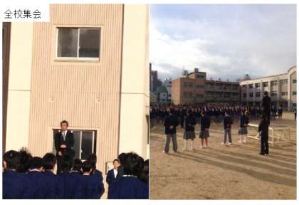 校長先生から、「師走に入り寒さも厳しくなってきましたが、期末テストが終わった後の期間が大事である。」また、ノーベル生理学・医学賞を受賞した山中伸弥教授のお話から、「日本人の学生の特性は粘り強く研究を続けていくことである。君たちも何事に対しても決してあきらめず、目標に向かって頑張ってほしい。」とのお話がありました。