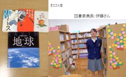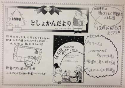 先日の各種委員会終了後、図書委員の伊藤さん、山縣君(2年生)が1年生が書いた、朝読書の感想文を、図書室内にきれいに飾ってくれました。(クリスマスツリー風)