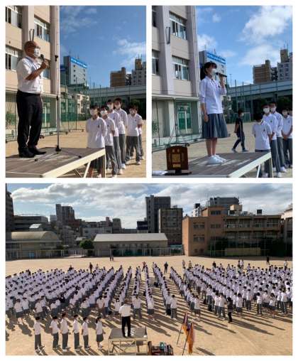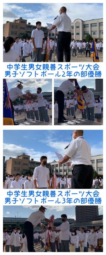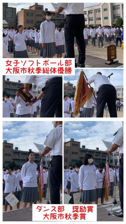 まず、大阪市秋季総合体育大会において女子ソフトボール部優勝とダンス部奨励賞の賞状伝達が、中学生男女親善スポーツ大会ソフトボール部で2年男子優勝と3年男子準優勝の賞状伝達がそれぞれありました。