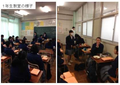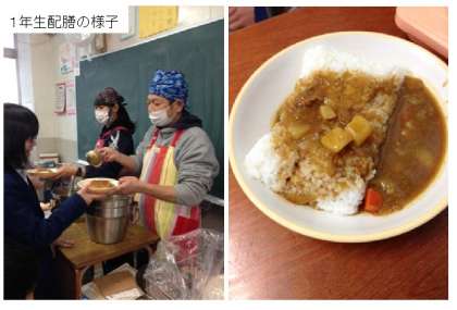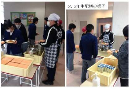 1年生は、全員喫食なので各教室で先生が食缶から分けています。2,3年生は2階のエレベーター前で、先生が食缶から分け、申し込んでいる生徒が取りに来ます。