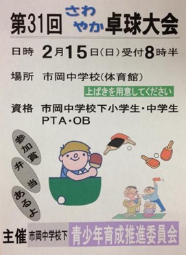 青少年育成推進委員会が主催する第31回「さわやか卓球大会」の案内を本日生徒に配布いたしました。よければご参加いただきますようお願いいたします。