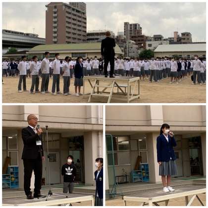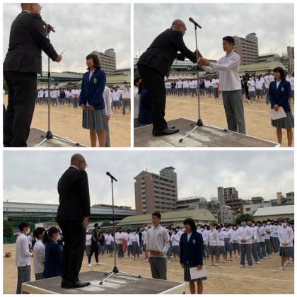 まず、先週金曜日に実施した体育大会の3年成績発表で誤りがありましたので、訂正と追加の表彰がありました。