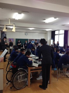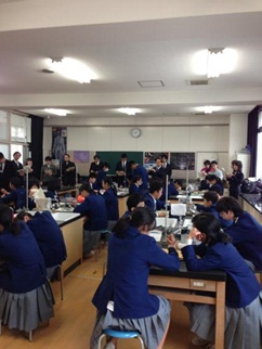 本校教員である近藤先生(2年2組担任、理科)が研究授業を行い、大阪市全体から新任理科担当教員14名が集まり、近藤先生の授業(2年2組)を見学しました。