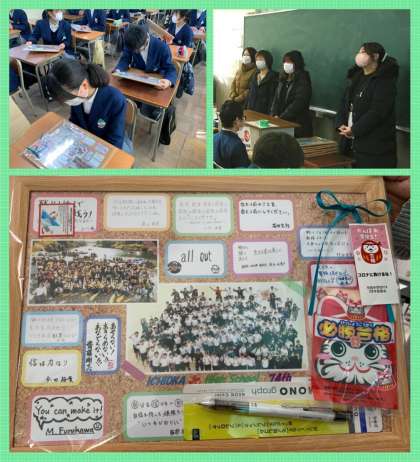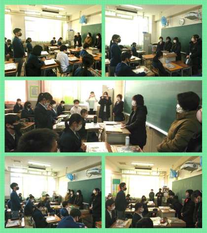 2月5日(金)、3年PTA実行委員の方々から受験に向けての激励会をしていただきました。例年は講堂で全クラス一斉に行われますが、コロナ禍のため今年は各クラスでお願いしました。PTA学年委員長様から激励のお言葉の後、激励のフォトフレームと記念品を一人一人手渡しで頂きました。生徒たちもそれに応え、身の引き締まる面持ちで食い入るように見ていました。