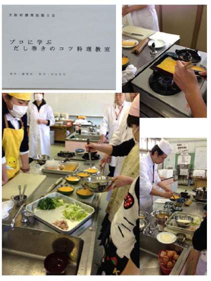 (10)「プロに学ぶだし巻のコツ料理教室」 大阪府調理技能士会から講師4名が来られ、生徒13人が受講しました。