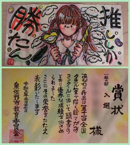 「第11回タオル筆で描く絵手紙コンクール」において、3年生が一般の部で入選しました。