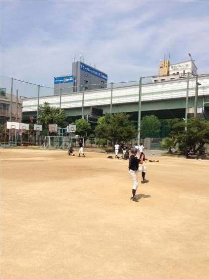 36度の猛暑の中、運動場では野球部とソフトボール部が練習に励んでいます。