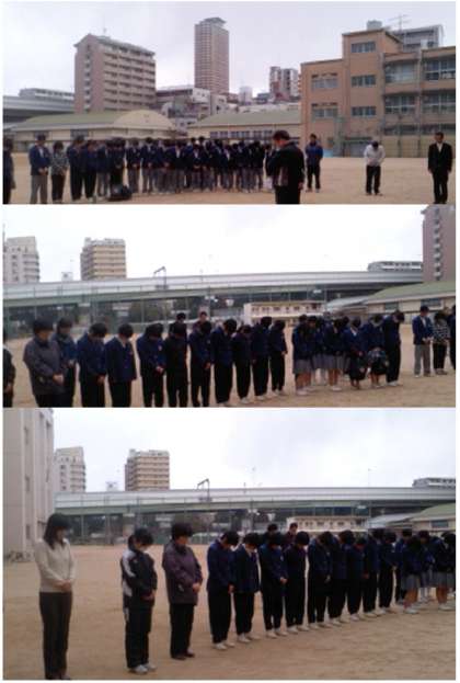 政府から、「東日本大震災四周年追悼式」を行うので、14時46分に黙とうを捧げる協力依頼がありました。そこで、本校では明日の卒業式準備で残っていた生徒と教職員で運動場にて1分間の黙とうを捧げました。