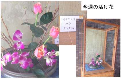 毎週、地域にお住いの平岡様にボランティアで玄関にある花台の活け花を交換していただいています。