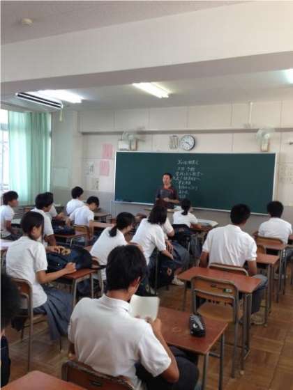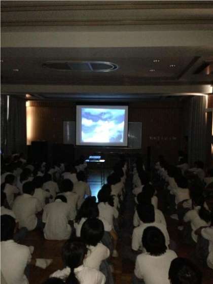 本日1,3年生の登校日です。3年生は空調設備が整っている教室で、各担任からそれぞれお話がありました(左側)。1年生は多目的室で一同に集まり、「つるにのって」のビデオを見て、反戦平和の学習をしました(右側)。