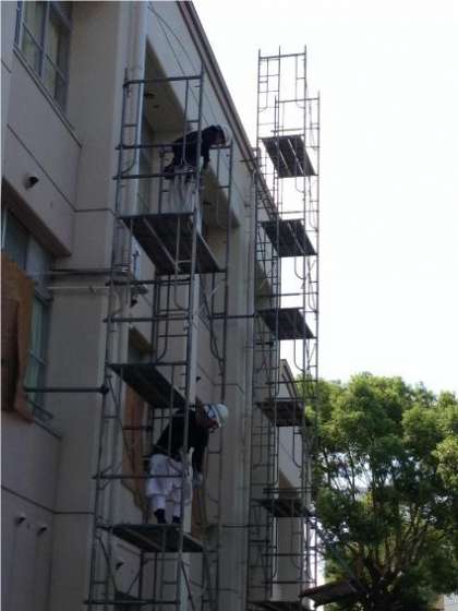 来週26日始業式に向け、空調設備工事も順調に進んでいます。今日は足場の解体作業が行われています。そして、明日は試運転。何とか始業式に間に合いそうです。
